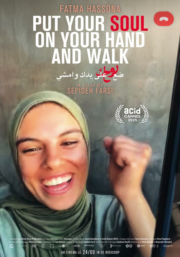 Put your soul on your hand and walk est un film qui nous fait ressentir la guerre, comme rarement. C’est un documentaire avec un dispositif particulier : Sepideh Farsi, cinéaste iranienne, autrice déjà de plusieurs documentaires, a voulu se rendre à Gaza après le déclenchement de la guerre post 7 Octobre 2023 par le gouvernement israélien, avec l’intention d’en réaliser un nouveau. Mais elle n’a pas eu l’autorisation de pénétrer sur ce territoire. Alors qu’elle résidait en Egypte, un ami lui a proposé de la mettre en contact avec une jeune photographe gazaouie, Fatma Hassona. Dès lors, elle s’est filmée appelant la jeune femme, et chaque fois qu’elle réussissait à la joindre, elle a filmé son téléphone, sur lequel le visage lumineux de Fatma (qu’elle appelle Fatem, dans le film) apparaît.