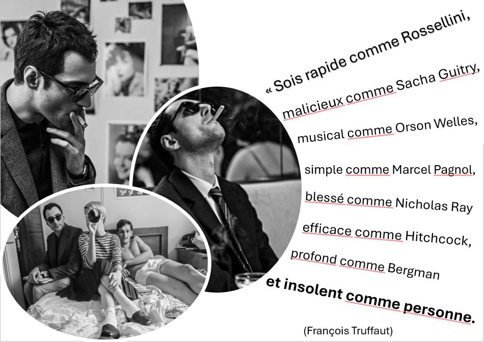 La reconstitution est phénoménale. Voit-on Godard ronger son frein aux Cahiers, parce qu’il sait que Truffaut va présenter Les 400 coups au Festival de Cannes et qu’il n’y est pas ? Scène suivante : il y va et nous avec ! Les voitures, les kiosques à journaux, la cigarette partout tout le temps, tout transpire l’époque. Paradoxe : de par ses moyens et la fidélité scrupuleuse de cette reconstitution, le film n’est pas godardien. Le noir et blanc, forcément pour évoquer un film tourné lui-même en noir et blanc, est sublime. Et les acteurs, quel charme ! Guillaume Marbeck reproduit à la perfection le phrasé si particulier de Godard, il compose un JLG qui nous a semblé plus charmant que l’original, drôle, souriant même, mais c’est qu’on n’a connu le vrai Godard que vieux. On a l’image de quelqu’un d’austère mais sur le tournage de son premier film, alors qu’il a mis tant de temps à y arriver, après tous ses camarades, on peut l’imaginer heureux. Aubry Dullin a réussi à choper quelque chose de Jean-Paul Belmondo, une nonchalance, une gouaille, un large sourire et un menton en galoche qui rappellent indéniablement Bébel. Et Zoey Deutch a l’accent américain craquant de Jean Seberg, son arrogance de star déstabilisée et dépitée de ne pas tourner avec Truffaut, mais qui s’adapte et joue le jeu, sans se douter qu’elle est en train de tourner le film le plus important de sa carrière.