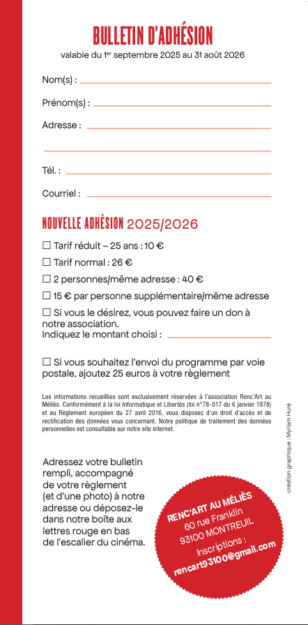 Vous pouvez utiliser le formulaire de demande d’adhésion ci-dessous ou remplir ce même bulletin à retrouver au cinéma Méliès dans les présentoirs de l’association, en bas de l’escalier au rez-de-chaussée du cinéma. Ensuite, vous pouvez le déposer avec votre règlement et une photo dans la boîte aux lettres rouge (en bas de l’escalier) ou l’envoyer à l’adresse de l’association : Renc’Art au Méliès, 60 rue Franklin, 93100 Montreuil.